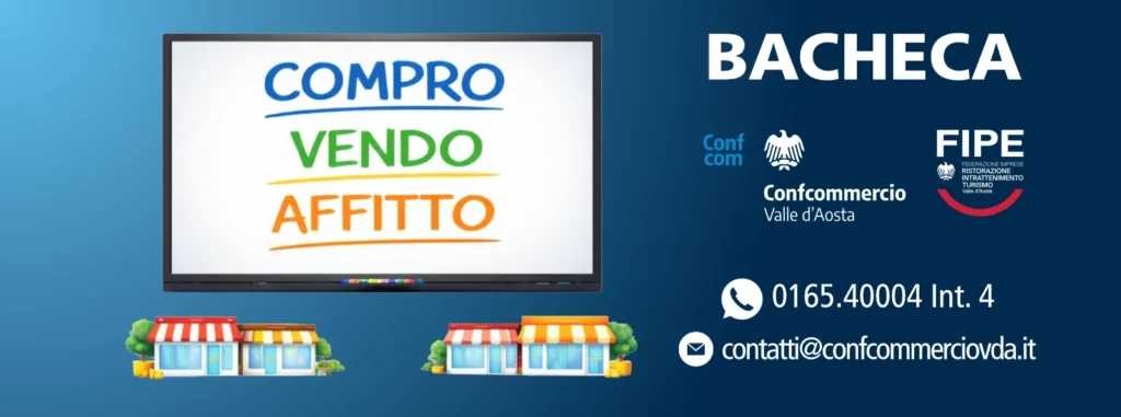 - VENDESI POSTI PER ATTIVITÀ MERCATALEVendesi posti per attività mercatale in diversi luoghi della Valle D’Aosta: Posto 1: Verrès - lunedì Posto 2: Aosta - martedì Posto 3: Courmayeur - mercoledì (stagione estiva) Posto 4: Saint-Vincent - giovedì Posto 5: Champoluc - venerdì (stagione estiva) Posto 6: Aosta - sabato Posto 7: Antey-Saint-André - sabato (stagione estiva) Per informazioni contattare…