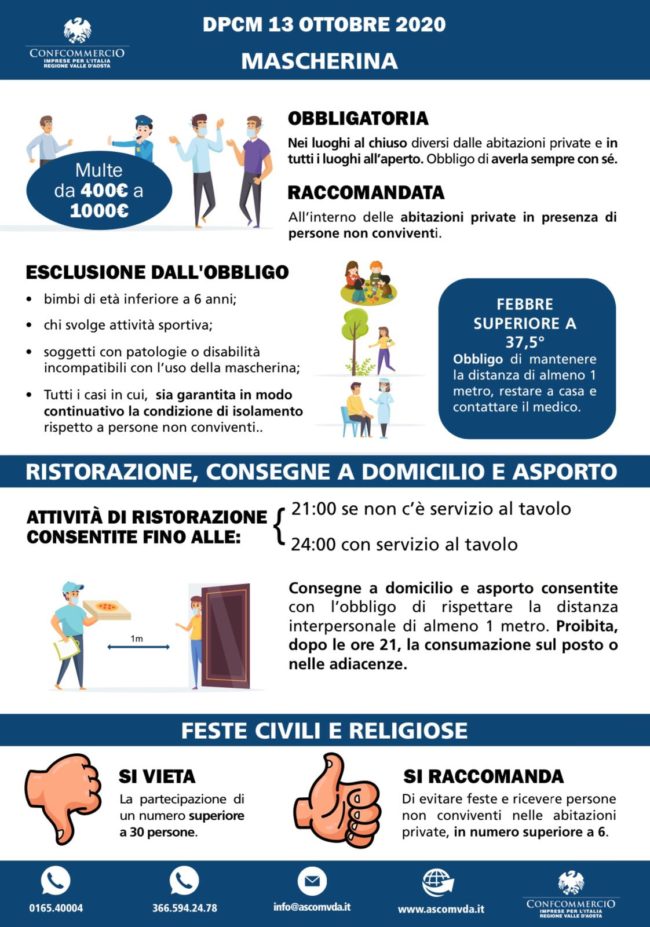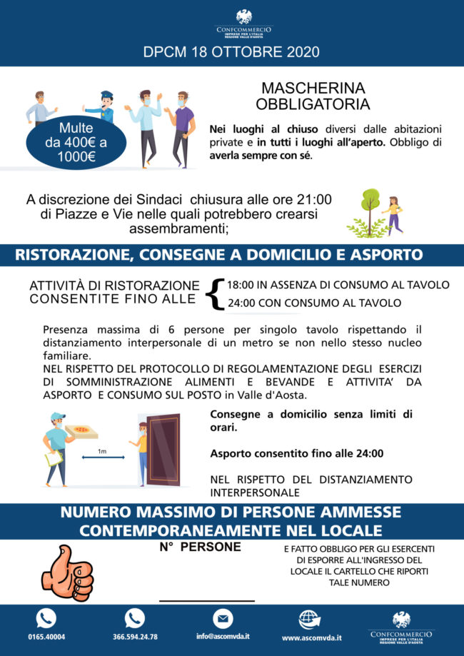 Confcommercio VdA ha creato un cartello esplicativo nei quali sono illustrati i punti salienti del Decreto del 18 ottobre 2020. Segui il cartello esplicativo e tutto sarà più semplice e comprensibile. E FATTO OBBLIGO PER GLI ESERCENTI DI ESPORRE ALL’INGRESSO DEL LOCALE IL CARTELLO CHE RIPORTI IL NUMERO MASSIMO DI PERSONE AMMESSE CONTEMPORANEAMENTE NEL LOCALE…