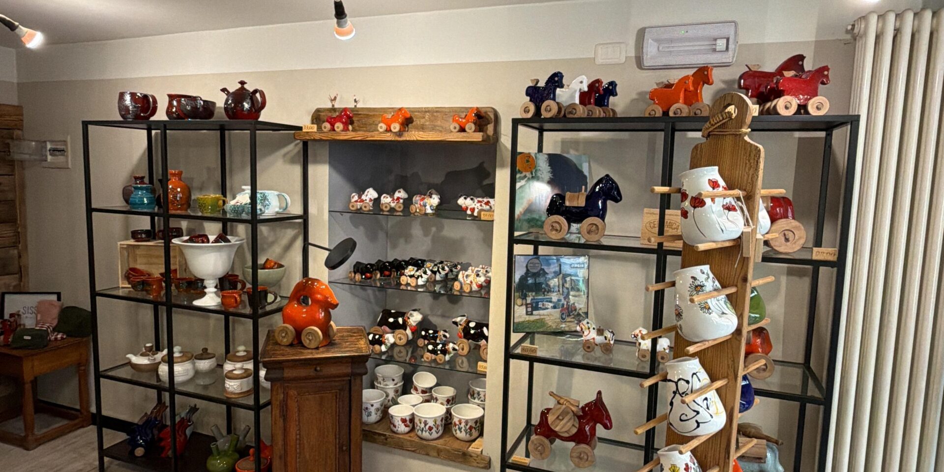 - Oggetti ispirati alla fauna alpina, come volpi, scoiattoli, conigli e mucche in ceramica smaltata con raffinati inserti in legno di frassino.