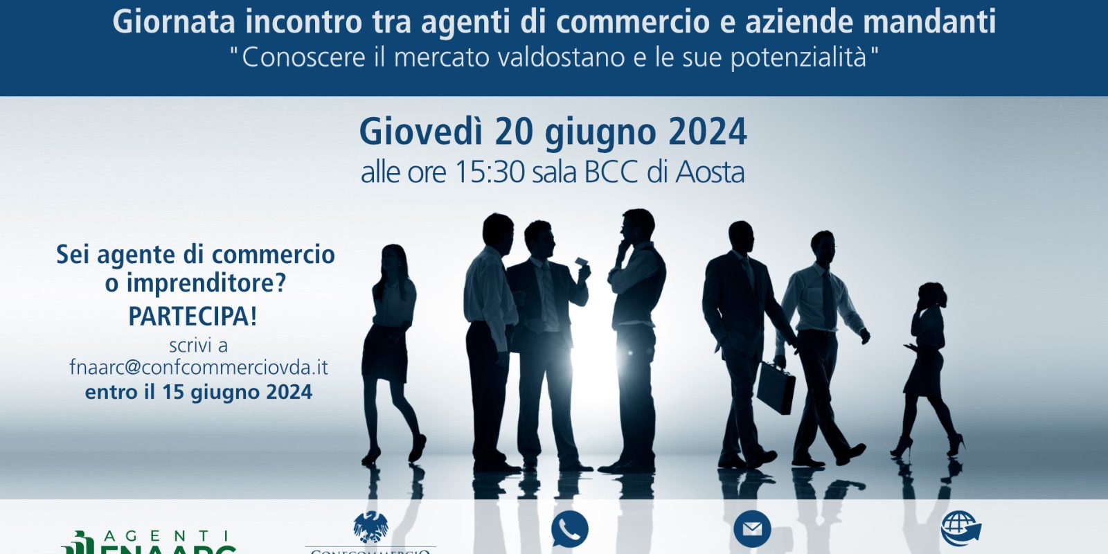 Sei un agente di commercio o un imprenditore in Valle d'Aosta? Non perdere l'occasione di partecipare alla Giornata di Incontro tra Agenti di Commercio e Aziende Mandanti, che si terrà il 20 giugno 2024 alle ore 15.30 presso sala BCC sita in Via Garibaldi, 3 ad Aosta.