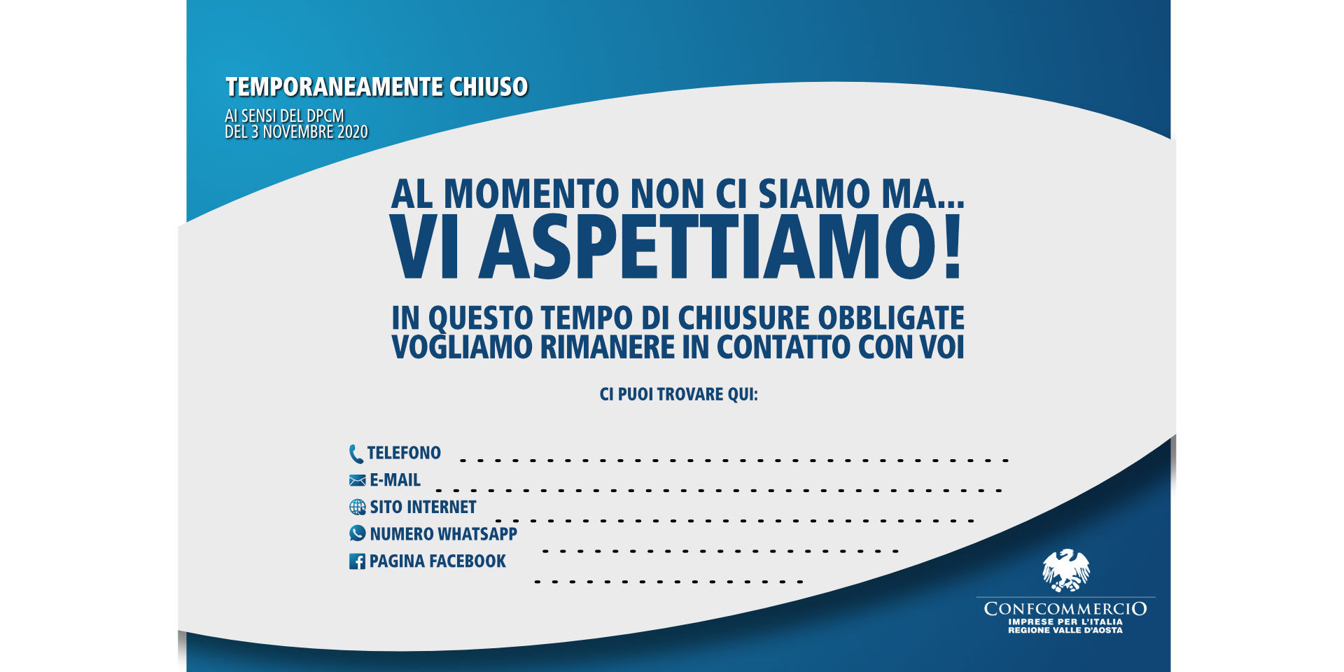 Con grande rammarico vi forniamo il cartello per comunicare alla clientela la temporanea chiusura delle attività a causa delle norme contenute nel DPCM del 3 novembre e della collegata Ordinanza del Ministro della Salute.