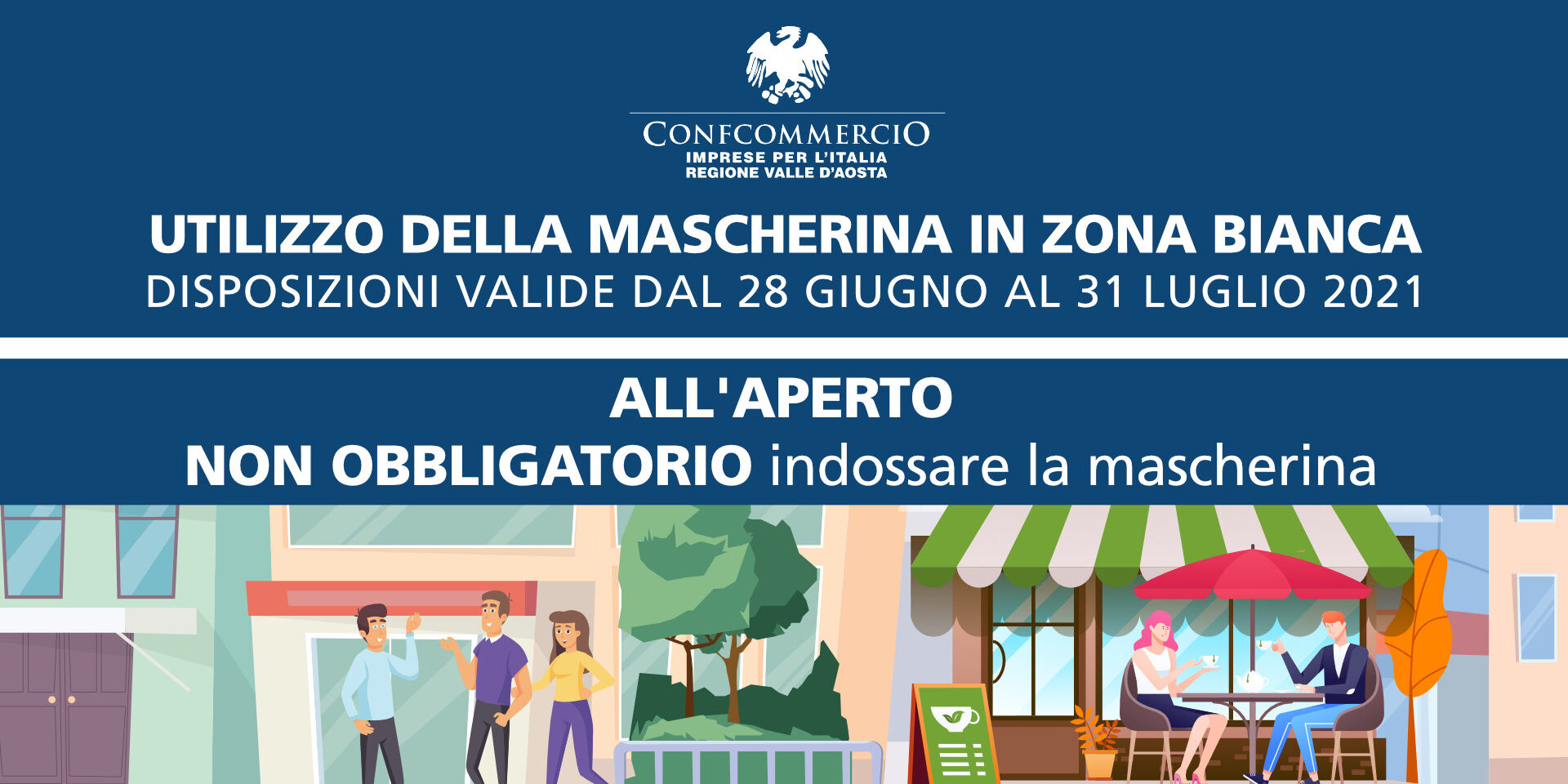 Dal 28 giugno, nelle zone bianche, cessa l'obbligo di indossare dispositivi di protezione delle vie respiratorie negli spazi all'aperto. Permane l'obbligo di avere sempre con sé tali dispositivi e di indossarli nelle situazioni in cui non possa essere garantito il distanziamento interpersonale o si configurino affollamenti.