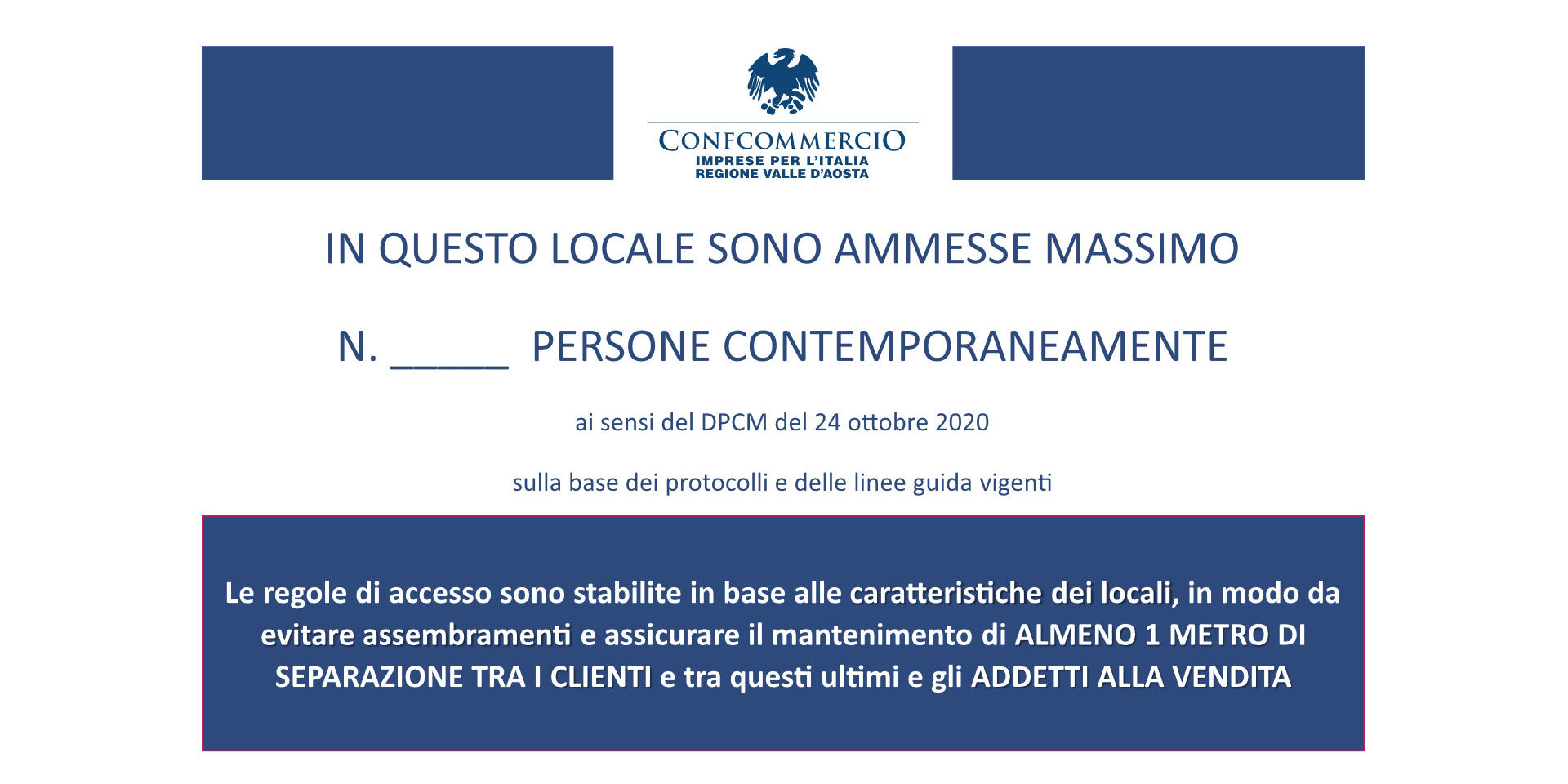 In base alle disposizioni del DPCM del 24 ottobre 2020, Confcommercio VdA ha predisposto un CARTELLO da esporre in vetrina da compilare a cura delle imprese per il NUMERO MASSIMO DI PERSONE CHE POSSONO ESSERE AMMESSE CONTEMPORANEAMENTE NEL LOCALE sulla base di specifiche caratteristiche dei locali e degli spazi. La vendita è di per sè dinamica, ma potrebbe essere utile prevedere dei punti sul pavimento per garantire il distanziamento di almento un metro in ogni direzione nei momenti di attesa.